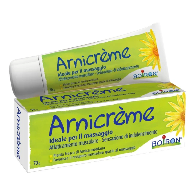 Prodotto cosmetico. Arnicrème è formulata utilizzando la pianta fresca di arnica montana, nota da diverse centinaia di anni per le sue proprietà lenitive. Dopo qualsiasi sforzo fisico, massaggiare con Arnicrème le zone particolarmente sollecitate in caso di affaticamento muscolare o di sensazione di indolenzimento. Il massaggio con Arnicrème favorisce il progressivo recupero muscolare dopo lo sforzo. Contiene il 7% di estratto di pianta fresca di arnica montana. È stata specificamente formulata per un gradevole massaggio grazie alla texture fluida e leggera. Non unge e non secca la pelle. Non contiene profumo e parabeni.