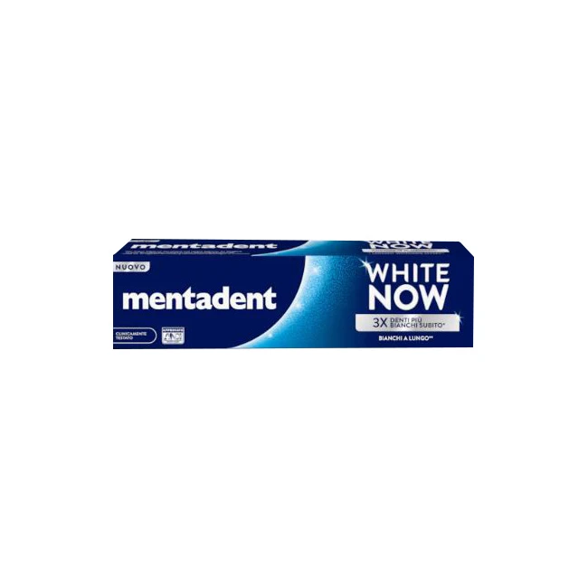 DescrizioneDentifricio Mentadent White Now combina due benefici clinicamente testati: White-Correct Technology, tecnologia migliorata con blue-sapphire & green pigments per un sorriso 3 volte più bianco subito, White-Infinity Technology, i minerali di origine naturale aiutano a rimuovere le macchie superficiali per denti bianchi a lungo.