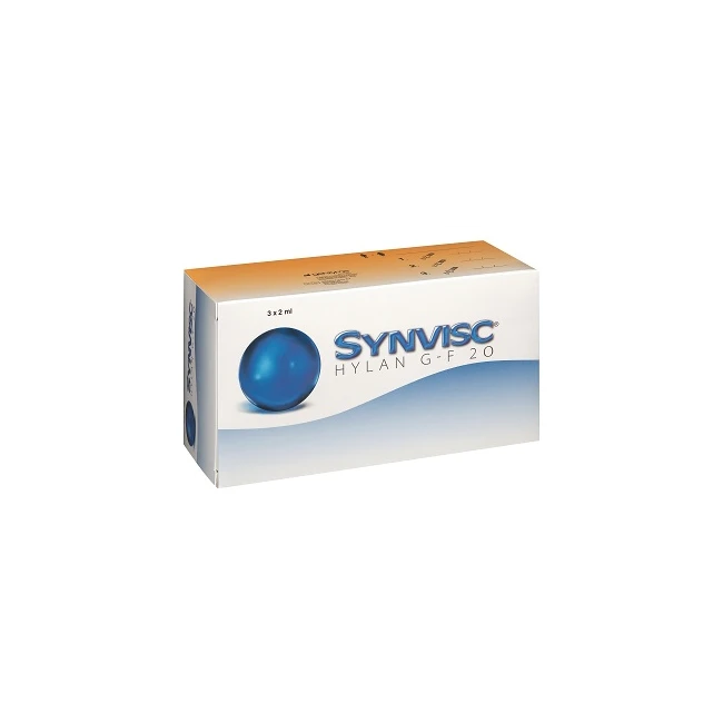 Synvisc viene fornito in tre siringhe di vetro da 2,25 ml cad. preriempite con 2 ml cad. di Hylan G-F 20.