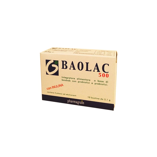 I fermenti lattici sono dei microrganismi vivi di origine batterica in grado di influenzare positivamente lo stato di salute attraverso il riequilibrio della flora intestinale. Baolac 500 è un integratore alimentare a base di baobab e inulina, con probiotici e prebiotici, indicato nei casi di ridotto apporto con la dieta o di aumentato fabbisogno di tali elementi. L'adansonia digitata L. (Baobab) favorisce un'azione di sostegno e ricostituente, contribuisce alle naturali difese dell'organismo e alla regolarità del transito intestinale. L'inulina e i fermenti lattici favoriscono l'equilibrio della flora intestinale. Contiene fruttosio ed edulcoranti.