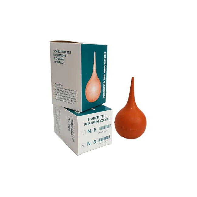 Schizzetto per irrigazione in gomma naturale. Per mantenere inalterata nel tempo l'efficienza di questo schizzetto, si consiglia di lavarlo dopo ogni uso con acqua e sapone nel caso di impiego di sostanze grasse. Sterilizzabile a 120°C.