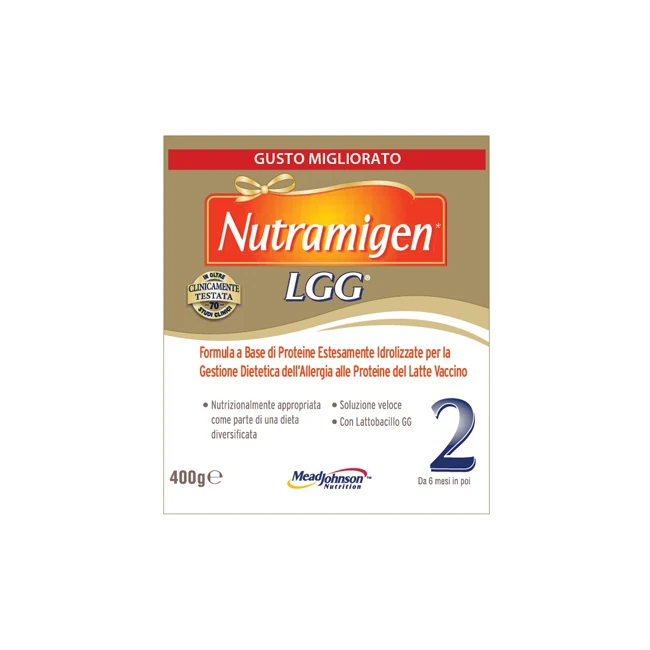 Formula nutrizionalmente completa a base di caseina estesamente idrolizzata, realizzata per soddisfare il fabbisogno giornaliero del lattante con allergia alle proteine del latte vaccino. È la prima formula per lattanti allergici con i livelli di DHA (Omega 3) raccomandati, che favoriscono il normale sviluppo visivo. Nutramigen 2 contiene il probiotico LGG, una combinazione che favorisce la gestione dietetica dell'allergia al latte vaccino e che aiuta a ritornare più velocemente ad una dieta normale. La formula estesamente idrolizzata ha un sapore ed un odore diverso dalle formule standard per l'infanzia; occorre quindi far abituare il lattante.