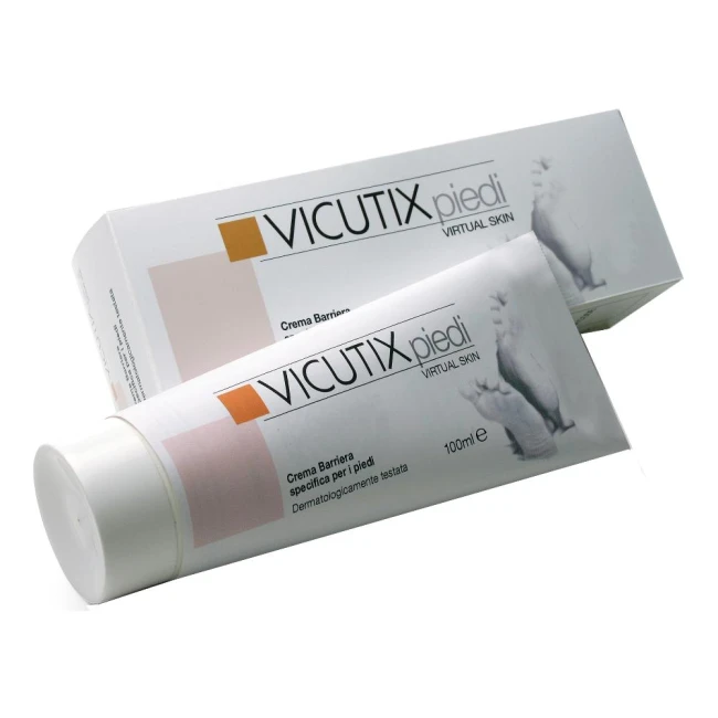 Vicutix Piedi è una crema che protegge dal contatto con agenti irritanti quali detergenti, solventi, detersivi, collanti, sostanze alcaline, grassi, oli, cromo, nickel, lana di vetro, grafite, cemento, calcare. Assicura una dermoprotezione contro infezioni micotiche, formazione di calli, lesioni e screpolature. Riduce i problemi della macerazione dei piedi, resiste ai lavaggi ed è atossico.