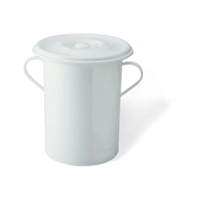 In plastica sanitizzabile.Con coperchio e maniglie.