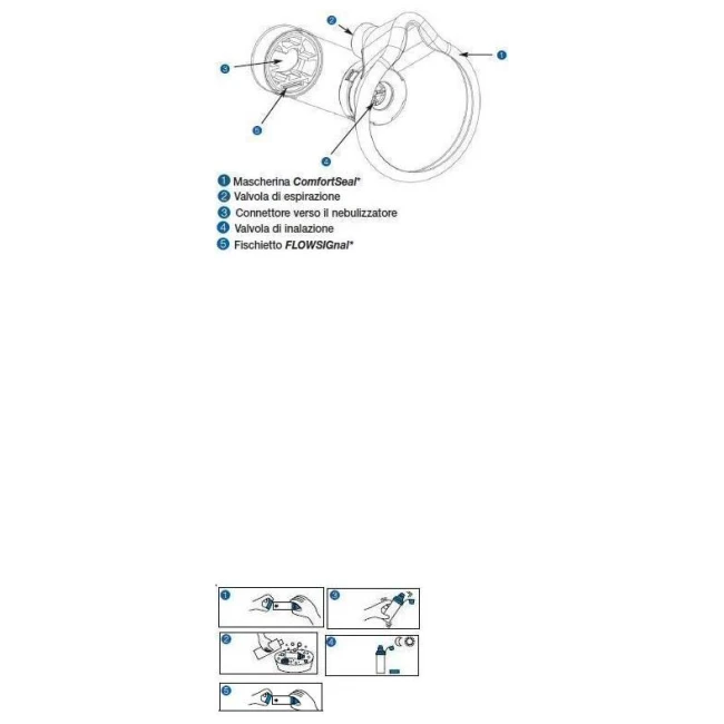 - premere il nebulizzatore una volta sola iniziando a inalare lentamente. Tenere saldamente la mascherina sul viso del paziente per 5-6 respiri. Per ottenere il risultato migliore, incoraggiare il paziente a respirare attraverso la bocca. L’aria espirata fuoriesce dalla mascherina attraverso la valvola di espirazione. Il fischietto FLOWSIGnal* emette un sibilo quando il paziente inspira troppo velocemente;