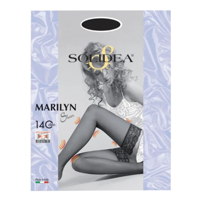 Calza autoreggente 140 denari a maglia liscia. Particolarmente velata ed elegante, con morbida balza in pizzo. La compressione graduata 18/21 mmHg aiuta la circolazione sanguigna ed evita l’aggravarsi di problemi da insufficienza venosa. Con soletta anatomica anti-stress.Con funzione igienica Sanitized.