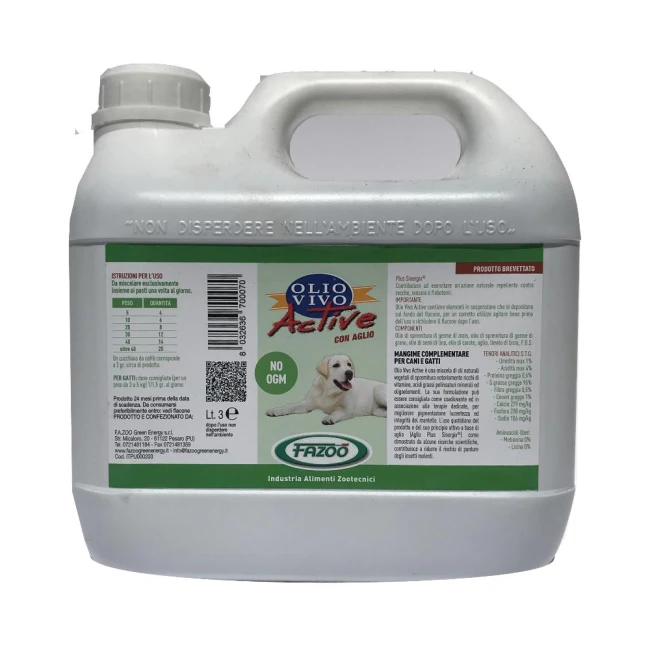 Mangime complementare per cavalli. L'utilizzo quotidiano dell'Olio Vivo è consigliato per ottenere un mantello integro e lucente, contribuendo a migliorare il sistema immunitario, l'apparato muscolare e cardiovascolare. Coadiuvante, nell'esercitare un'azione protettiva a favore dei bronchi, può contribuire a prevenire lo sbriciolamento dello zoccolo, anche grazie all'esistenza della biotina, contenuta nell'olio di spremitura di soia. La presenza dei F.O.S. contribuisce a migliorare l'efficienza della flora microbica intestinale e le funzionalità digestive. Olio Vivo è ottenuto dalla spremitura di semi oleosi contenenti vitamine naturali, biotina, lecitina ed acidi grassi polinsaturi omega 6 - omega 3, con aggiunta di sale marino della Normandia (ricco di oligo-elementi). La sua formulazione naturale ed appetibile partecipa nell'azione tonificante dell'animale.