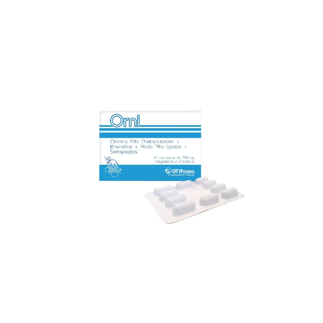 Bromelina (Ananas sativus) e.s. >0,3 bromelina, ornitina alfa-chetoglutarato (OKG), acido alfa-lipoico, serratiopeptidase 120.000 UI/g, maltodestrine, silice, magnesio stearato.