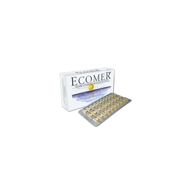 Integratore alimentare utile per favorire la funzione fisiologica espletata dal sistema immunitario contribuendo alla sua azione di difesa naturale.Ecomer è olio di fegato di squalo purificato contenente alchilgliceroli naturali. I sofisticati e brevettati processi di purificazione utilizzati garantiscono la standardizzazione del contenuto in alchilgliceroli (20 %).