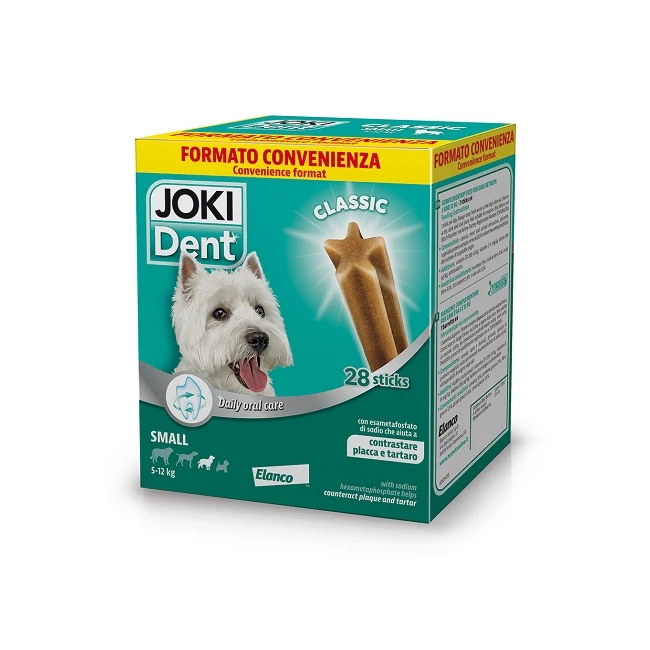 Alimento complementare per contribuire ogni giorno alla buona igiene orale del cane. Grazie ad ingredienti specifici come l'esametafosfato di sodio, Joki Dent Classic favorisce la salute dei denti e aiuta a contrastare la formazione della placca dentaria e del tartaro. Inoltre, grazie alla sua consistenza e alla particolare forma a stella, questo gustoso snack per cani favorisce una masticazione prolungata e contribuisce alla rimozione dei residui di cibo dai denti.