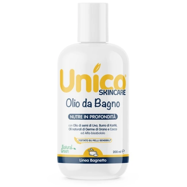 Unico Olio da Bagno svolge una delicata azione detergente, idratante, emolliente e lenitiva; nutre ed ammorbidisce anche pelli particolarmente secche, riequilibrando la normale fisiologia del film idrolipidico.
