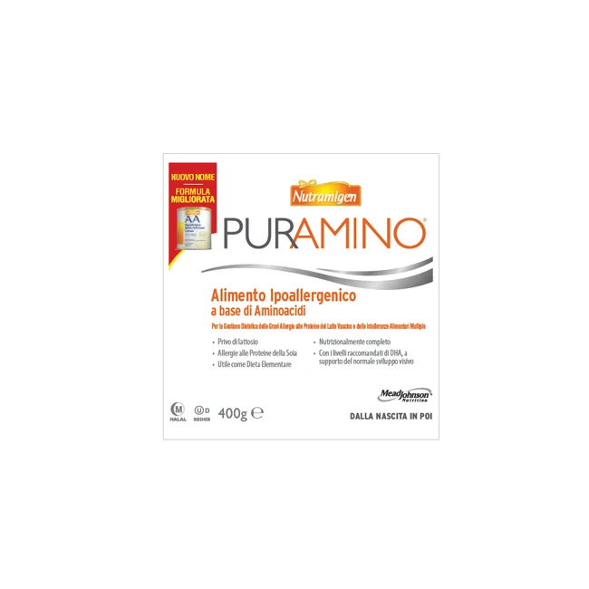 Formula ipoallergenica a base di aminoacidi realizzata per lattanti e bambini con grave allergia alle proteine del latte vaccino, intolleranze alimentari multiple o nei casi in cui si renda necessaria una dieta elementare. Nutramigen Puramino è privo di lattosio e contiene DHA, acidi grassi omega-3 che supportano il normale sviluppo visivo del lattante*. L'olio di trigliceridi a catena media fornisce una fonte di grassi ed energia facilmente disponibile in caso di malassorbimento dei grassi. Non cambiare formula senza avere consultato il pediatra che consiglierà inoltre l'introduzione di alimenti complementari nella dieta al divezzamento. Nutramigen Puramino, per la sua formulazione particolare, non ha il sapore e l'odore dei latti per la prima infanzia. I bambini alimentati con Nutramigen Puramino possono produrre feci morbide frequenti e di colore da verde a scuro.