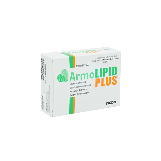 Armolipid Plus è un integratore alimentare di Berberis aristata e.s., riso rosso fermentato, policosanolo, acido folico, coenzima Q10 e astaxantina. La Berberis aristata e.s., contenuta in Armolipid Plus, favorisce il controllo del colesterolo e dei trigliceridi plasmatici ad integrazione di una dieta globalmente adeguata a tal fine.