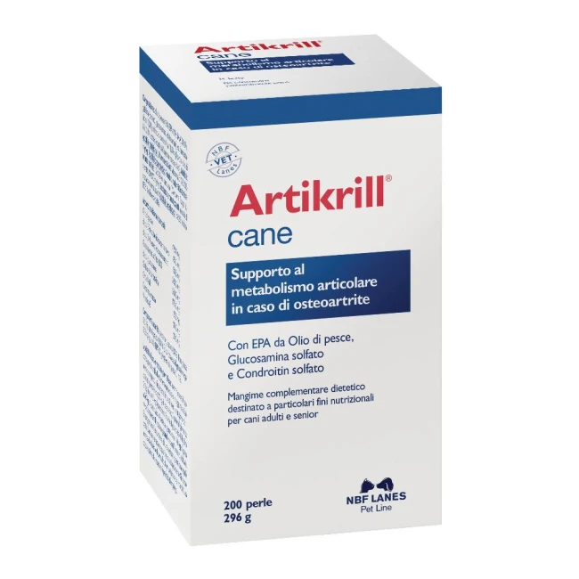 Artikrill cane è un mangime complementare dietetico formulato con acidi grassi omega-3 (EPA) da olio di pesce e con un livello adeguato di vitamina E per il supporto del metabolismo articolare in caso di osteoartrite del cane.