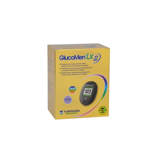 Confezione contenente 1 misuratore GlucoMen LX2, 1 penna pungidito Glucoject, 1x10 lancette pungidito Glucojet, 1 manuale d'uso, 1 guida rapida, 1 kit di emergenza DKA, 2 batteria CR 2450 (installate), 1 custodia porta strumento, 1 cartolina di garanzia, 1 guida informativa sul prelievo dei campioni di sangue.