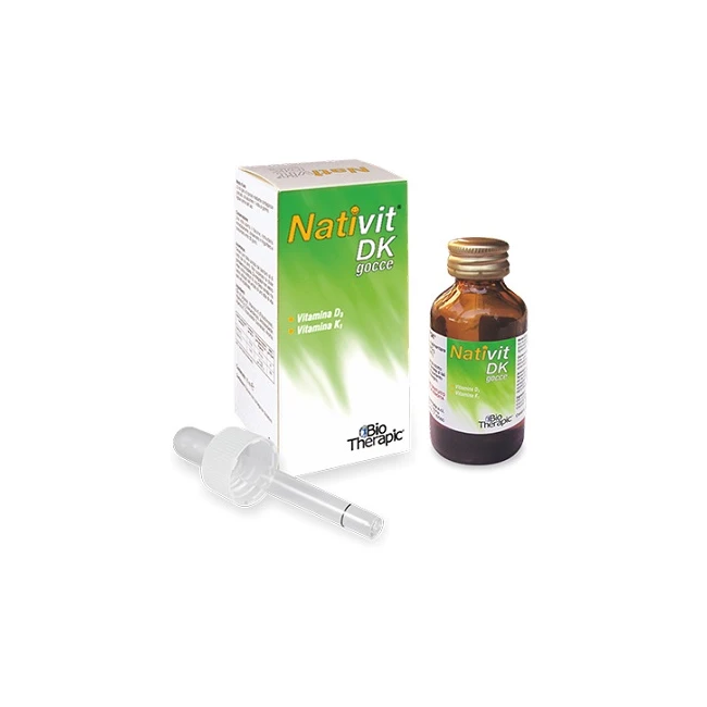 Nativit DK è un integratore alimentare con Vitamina D3 e Vitamina K1 utile nei casi di ridotto apporto con la dieta di tali sostanze o di aumento del loro fabbisogno.