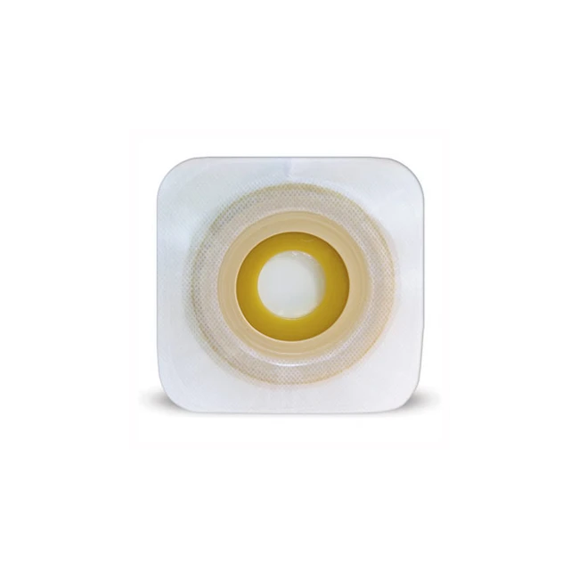 - Lo strato superiore in Tecnologia Durahesive; quando entra in contatto con gli effluenti si gonfia, assorbendo l’umidità e forma un caratteristico collarino (“effetto a collo di tartaruga”) intorno allo stoma, proteggendolo dal contatto con gli effluenti e prolungando il tempo di permanenza in situ del dispositivo.