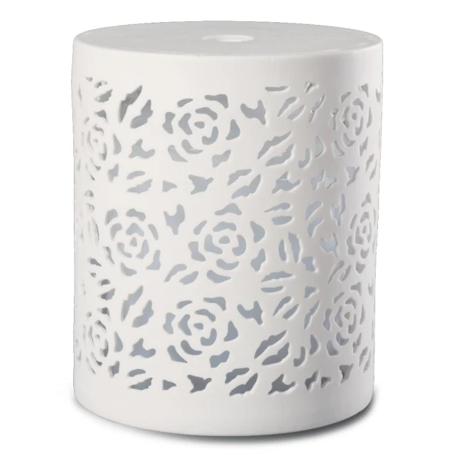 Diffusore elettrico con tecnologia ad ultrasuoni, per nebulizzare gli oli essenziali e sfruttarne le virtù aromaterapiche. Silenzioso e sicuro, genera vibrazioni ultrasoniche che permettono all'acqua di combinarsi rapidamente con gli oli essenziali, senza surriscaldarli o alterarne le proprietà: i benefici vapori prodotto, oltre a profumare e purificare l'aria, aiutano anche a microumidificarla. Nel contempo, grazie alla luce intercambiabile, possono alternare diverse sequenze cromatiche potenziando gli effetti delle essenze con le qualità riequilibranti, stimolanti e rilassanti dei colori. Questo modello "origami" è realizzato in ceramica con decorazioni traforate raffiguranti delle rose.