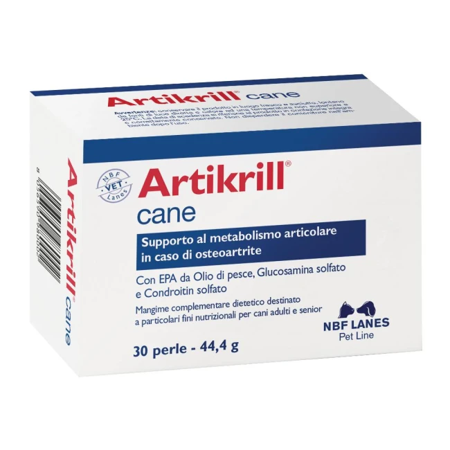 Artikrill cane è un mangime complementare dietetico formulato con acidi grassi omega-3 (EPA) da olio di pesce e con un livello adeguato di vitamina E per il supporto del metabolismo articolare in caso di osteoartrite del cane.