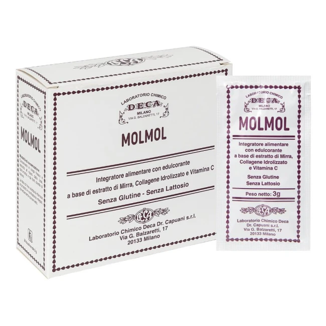 Integratore alimentare a base di mirra, idrolizzato di collagene e vitamina C; MOLMOL grazie alla vitamina C, contribuisce alla normale formazione del collagene per la funzione delle ossa, delle cartilagini e della pelle. Inoltre contribuisce alla riduzione della stanchezza e dell'affaticamento.
