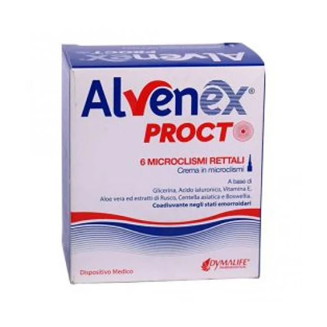 Alvenex Procto è un dispositivo medico a base di Glicerina, Acido ialuronico, Vitamina E, Aloe vera ed estratti di Rusco, Centella asiatica e Boswellia. E' un dispositivo medico con attività filmogena, protettiva e lubrificante, coadiuvante negli stati emorroidari e nei processi di normalizzazione della mucosa anale.