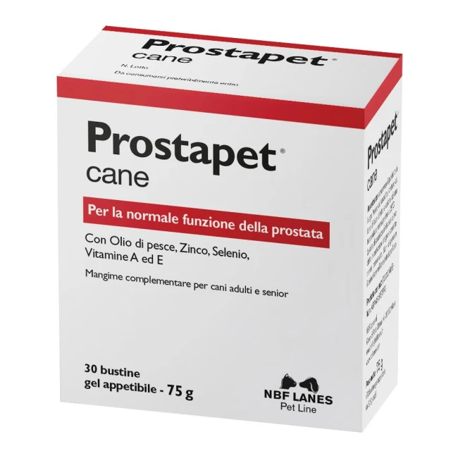 Mangime complementare per cani formulato con olio di pesce, zinco, selenio e vitamine A ed E per la normale funzione della prostata.