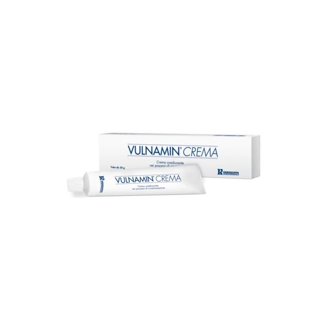 Vulnamin è una crema di origine non animale utilizzabile come coadiuvante per facilitare la cicatrizzazione di ferite sulle quali non è possibile intervenire mediante sutura e che hanno leso il derma, come ferite ulcerose croniche, piaghe da decubito. Facilita una più rapida rigenerazione dei tessuti e mantiene le condizioni di umidità ideali per favorire la riepitelizzazione delle lesioni cutanee.