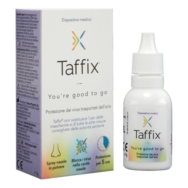 Il dispositivo spray nasale Taffix (polvere) è indicato per l'uso come barriera meccanica protettiva contro i virus all' interno della cavità nasale.