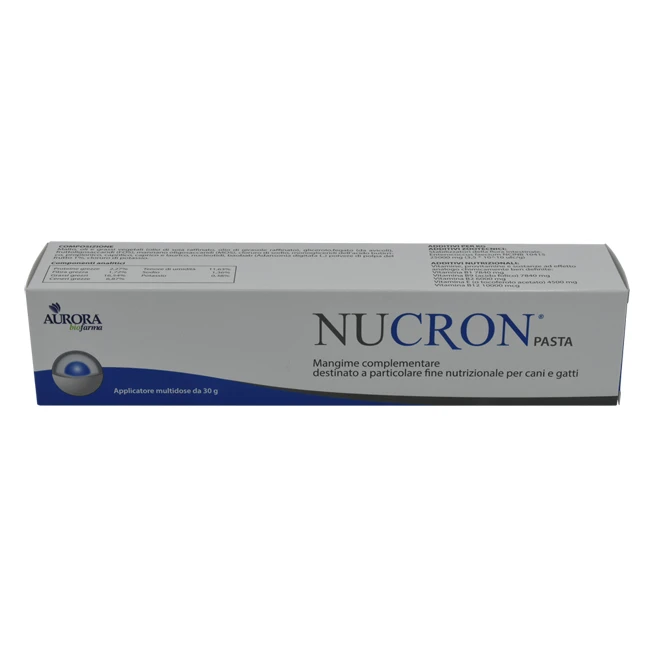 1 g di pasta ogni 5 kg di peso, 2 volte al giorno per i primi 3-5 giorni. Continuare con 1 g al giorno ogni 5 kg di peso. Somministrare Nucron per 1 o 2 settimane, secondo la necessità dell'animale o prescizione del medico veterinario.