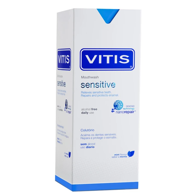 La sensibilità dentale si genera quando i tubuli dentinali rimangono allo scoperto per una usura eccessiva dello smalto dentale o per un indebolimento della gengiva. In questa situazione, stimoli esterni come il freddo, caldo, acidi, pressione tattile, eccetera, possono produrre una sensazione fastidiosa. Il collutorio Vitis sensitive include la tecnologia nano-repair Dentaid, che ripara naturalmente la superficie dello smalto, formando uno strato protettivo. L'effetto delle nanoparticelle di idrossiapatite è arricchito da nitrato di potassio, assicurando la cura dei denti sensibili.
