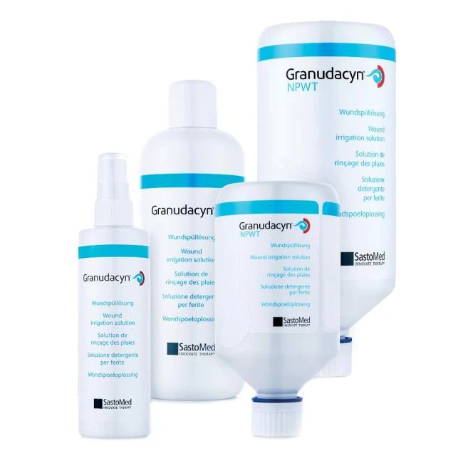Sciacquare accuratamente la ferita con Granudacyn e lasciare assorbire brevemente. Il procedimento può essere ripetuto diverse volte al giorno o ad ogni cambio della medicazione.