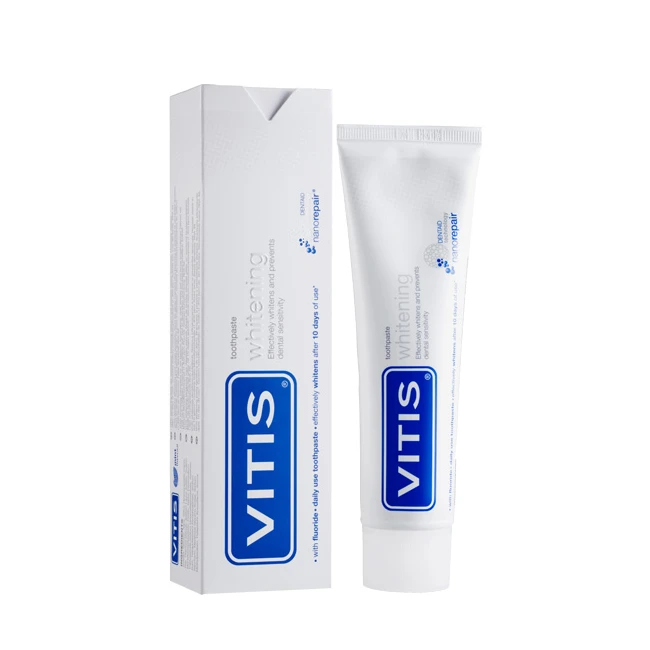 VITIS whitening dentifricio quotidiano, grazie alla sua formula esclusiva, sbianca efficacemente i denti, ripristina il loro bianco naturale e la lucentezza senza danneggiare lo smalto. Contemporaneamente previene la sensibilità dentinale.
