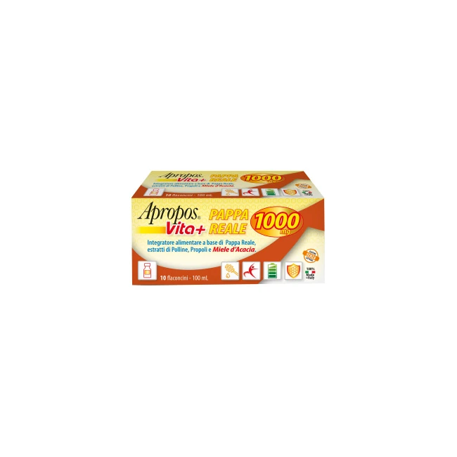 Apropos Vita+ Pappa Reale 1.000 mg è un integratore alimentare con un'altissima concentrazione di pappa reale fresca, nota sostanza prodotta dalle api come nutrimento esclusivo dell'ape regina. La sua formulazione si completa di polline, propoli e pregiato miele d'acacia, altri preziosi elementi dell'alveare. Il suo dosaggio molto ricco è particolarmente indicato per una pronta azione di sostegno. Il gusto squisito dato dal miele e i suoi pratici flaconcini monodose, lo rendono infine un prodotto adatto a tutta la famiglia.