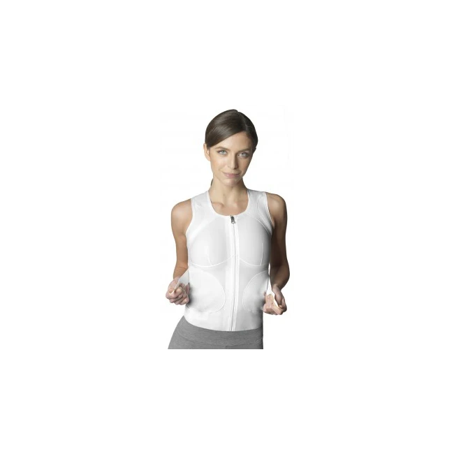Dispositivo B.A.C.K (Back Active Correction Keeper) per regolare la tensione retropulsiva delle spalle e di estensione del tratto dorsale costituito da: sistema di tiranti ancorati in quattro punti (spalla e tronco), tiranti a tensione regolabile con chiusure anteriori a strappo, fibbie sottoscapolari basculanti in funzione dell’orientamento dei tiranti regolabili, corpo maglia senza maniche, in tessuto contenitivo, elasticizzato, traspirante, confortevole e wash&wear (antipiega). Chiusura a cerniera (Nichel free) per facilitare la vestizione e con funzione di rinforzo strutturale. Bordatura in silicone antiscivolo. Inserti in velour per l’ancoraggio dei tiranti regolabili. Inserti in velour sagomati anatomicamente per concentrare le forze di spinta retropulsiva.