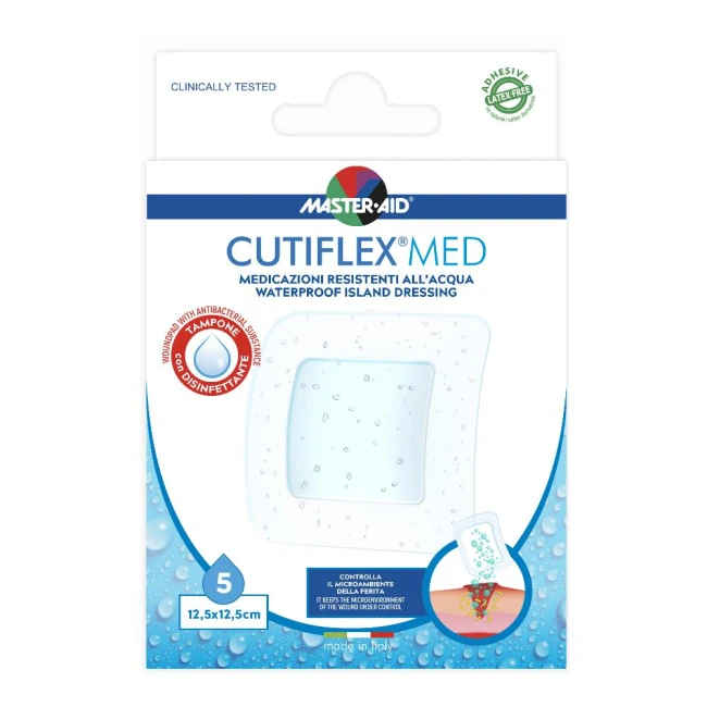 Dispositivo medico CE 0373. Medicazione in poliuretano, flessibile, elastica, sottilissima (20 micron) e trasparente che aderisce in modo ottimale (come una seconda pelle) e protegge la ferita anche in caso di immersione totale in acqua. CUTIFLEX protegge la ferita dagli agenti esterni e favorisce il processo di guarigione mantenendo umido l'ambiente sotto la medicazione senza causare macerazione.• Collante ipoallergenico, adatto a tutti i tipi di pelle, anche quelle delicate di bambini e anziani. Elevata adesività, anche durante l'immersione in acqua. Privo di lattice di gomma naturale.