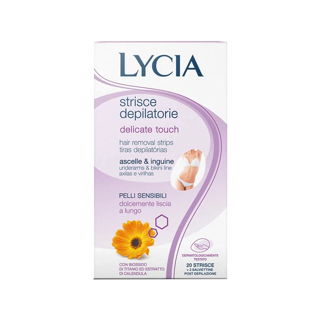 Strisce depilatorie per ascelle e inguine, per pelli sensibili. Con biossido di titanio ed estratto di calendula. La cera con biossido di titanio aderisce più ai peli e meno alla pelle per un effetto "No Shock". L'estratto di calendula ha proprietà lenitive ed emollienti. Il tessuto dona al prodotto morbidezza nell'estirpare in modo duraturo ma con delicatezza i peli superflui. Dermatologicamente testato.
