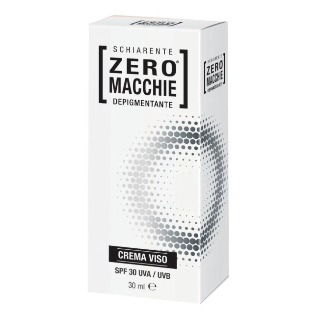 Zero macchie crema viso è un trattamento idratante che contrasta la formazione di macchie cutanee del viso donando un aspetto più omogeneo e luminoso alla pelle. Ideale anche per il Décolleté. Con filtro solare SPF 30 UVA/UVB. Resorcinolo e rame gluconato: azione inibitrice dell'iperproduzione di melanina. Arbutina: azione depigmentante. Resveratrolo: azione idratante ed antiossidante. Vitamina E: per contribuire a rallentare l'invecchiamento cellulare. Estratti vegetali: per conferire luminosità ed uniformità alla pelle del viso. SPF 30 UVA/UVB: per proteggere la pelle dai danni dovuti all'esposizione solare.