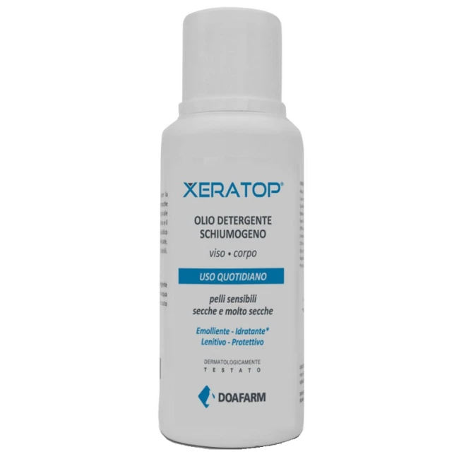 XERATOP OLIO detergente schiumogeno è stato specificamente formulato per la detersione viso e corpo di pelli sensibili, secche,molto secche e/o arrossate. Allevia il prurito. Grazie alle sostanze attive in esso contenute (oli, acido jaluronico, vitamina E, aloe vera, dipotassio glicirizzinato, bisabololo) previene la secchezza e favorisce il ripristino ed il mantenimento del film idrolipidico cutaneo.