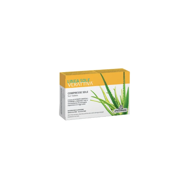 Integratore alimentare a base di carota e L-tirosina, con beta-carotene, licopene, selenio, rame e zinco, arricchito con estratti di aloe, melagrana e polypodium. Il polypodium favorisce la funzionalità della pelle mentre la melagrana, lo zinco, il rame e il selenio contribuiscono alla protezione delle cellule dallo stress ossidativo. Verattiva Compresse Sole può essere utile nel periodo estivo in cui si ha una prolungata esposizione della pelle ai raggi solari. Con edulcorante.