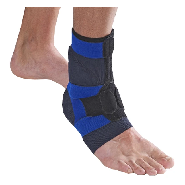 Doppia benda di stabilizzazione con protezione del collo del piede. Regolazione con chiusura a strappo anteriore e cinturino elastico superiore.
