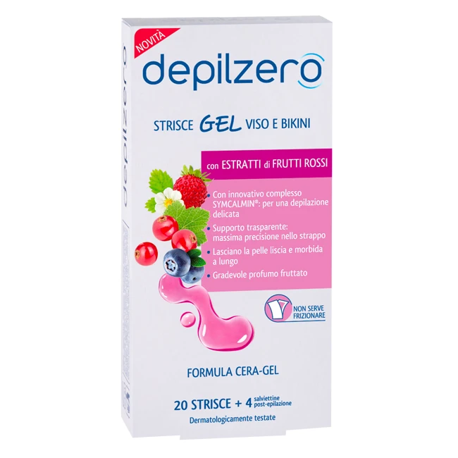 Strisce gel per viso e bikini. Caratterizzate da un gradevole profumo fruttato, grazie alla formula cera-gel e al supporto trasparente, le nuove strisce Depilzero Gel Viso e Bikini garantiscono massima precisione nello strappo, assicurando risultati perfetti e duraturi. La formula senza colofonia, è inoltre dermatologicamente testata per la massima sicurezza e tollerabilità.