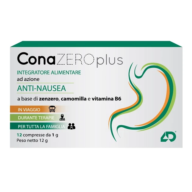 Integratore alimentare a base di estratto di camomilla, vitamina B6 e zenzero ad azione antinausea e digestiva indicato per la nausea da viaggio e per quella gravidica. Conazero plus in pratiche compresse orosolubili consente di essere assunto senza acqua. È facile e veloce da utilizzare in caso di bisogno e ha un gradevole gusto di limone.