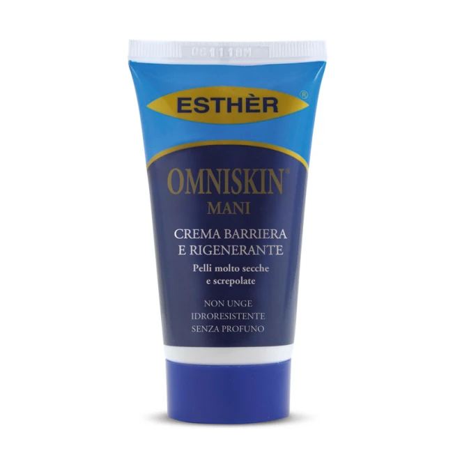 Omniskin Mani Crema Barriera e Rigenerante. Protegge la pelle dall'aggressione di agenti esterni e ripristina il livello di idratazione fisiologico della pelle consentendo alle mani di riacquistare la loro naturale morbidezza. Non unge. Resistente all'acqua. Senza profumazioni aggiunte per andare incontro alle pelli che ne sono sensibili. Indicato per pelli esposte ad aggressioni esterne, molto secche o screpolate.