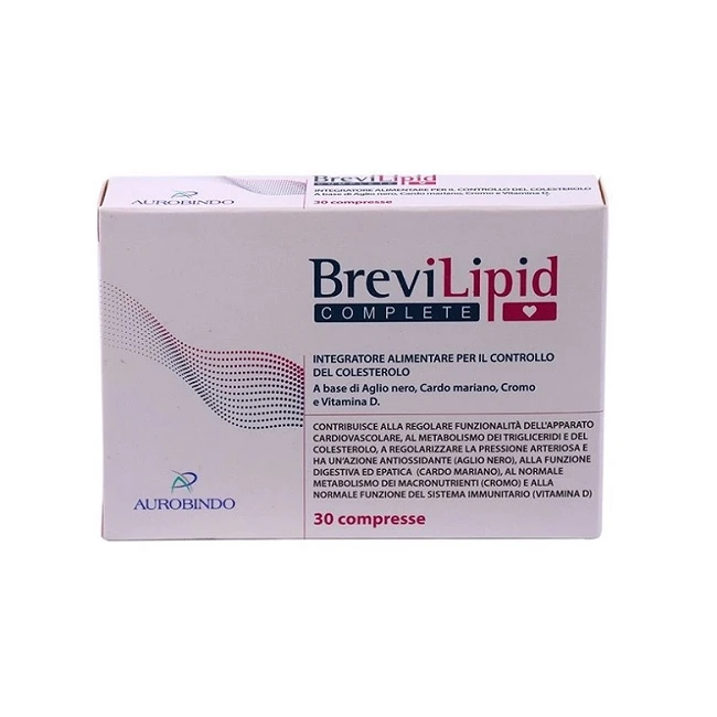 Brevilipid complete è un integratore alimentare a base di aglio nero che contribuisce alla regolare funzionalità dell'apparato cardiovascolare, al metabolismo dei trigliceridi e del colesterolo, a regolarizzare la pressione arteriosa e ha un'azione antiossidante. Il cardo mariano contribuisce alla funzione digestiva, epatica e ha un'azione depurativa dell'organismo e antiossidante. Il cromo contribuisce al normale metabolismo dei macronutrienti e la vitamina D contribuisce al normale funzionamento del sistema immunitario.