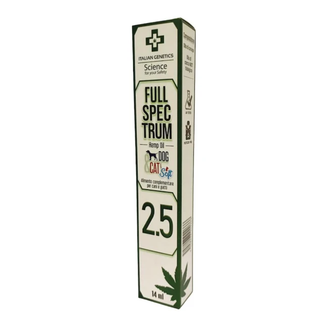 Full Spectrum Hemp Oil Dog & Cat è un mangime complementare per cani e gatti Il mangime complementare Full Spectrum Hemp Oil Dog & Cat nella versione SOFT è dedicato a cani e gatti di piccola taglia con peso tra 5 e 10 kg. Questo prodotto aiuta il buon mantenimento del sistema endocannabinoide dell'animale favorendone la sua salute generale. Senza pesticidi.