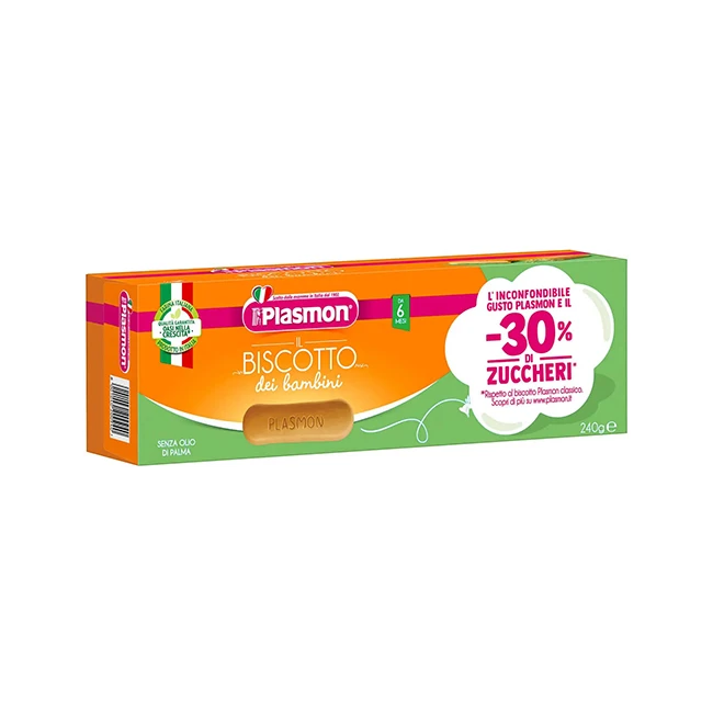 Alimento per l'infanzia. Prodotto in Italia. 100% grano italiano selezionato. Con il -30% di zuccheri rispetto al biscotto Plasmon classico. Con calcio, vitamina del gruppo B e ferro . Gusto inconfondibile Plasmon. Si scioglie in bocca e nel latte. Senza coloranti e conservanti, come per legge.