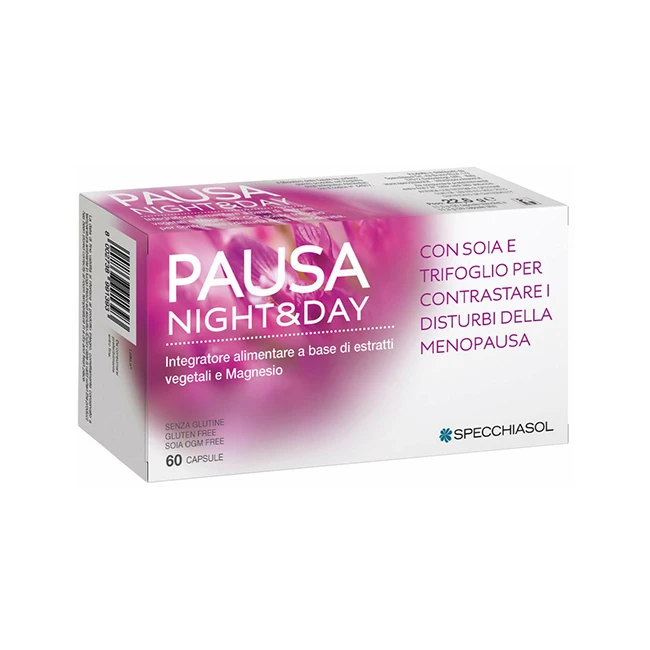 Pausa Night – capsula blu: igname (Dioscorea opposita Thum.) rizoma e.s. titolato al 16% in diosgenina; trifoglio rosso (Trifolium pratense L.) parte aerea e.s. titolato all’8% in isoflavoni, cimicifuga [cimicifuga racemosa (L.) Nutt.] e.s. rizoma titolato al 2,5% in glicosidi triterpenici; soia [Glycine max (L.) Merr.] semi e.s. titolato al 40% in isoflavoni.