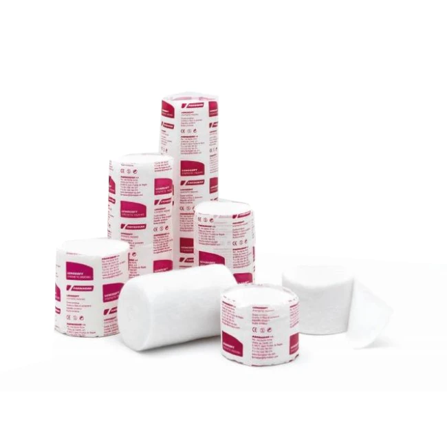 Ovatta sotto gesso sintetica. Materiale per imbottitura e protezione bianco in diverse dimensioni avvolto in involucro di carta. Tessuto non tessuto bianco, non irritante. La massa fibrosa mantiene la spugnosità, l’elasticità che permette una perfetta conformazione e protezione della pelle necessaria a seguito della pressione realizzata dai sistemi di immobilizzazione. La composizione e la resistenza del materiale permettono un’applicazione circolare e la capacità di trazione permette a sua volta di essere apposta in zone particolarmente difficili (gomiti, talloni ecc). La buona proprietà del sintetico Lenosoft non si perde quando si utilizza per un lungo periodo. Per sua naturalezza il materiale presenta un effetto adesivo che facilita l’applicazione richiedendo una semplice manualità. Una volta applicata mantiene uno strato liscio di spessore uniforme che evita punti di pressione che potrebbero creare problemi locali di circolazione. Permeabile all’aria, Lenosoft compensa la temperatura in quanto le fibre non assorbono l’umidità e, nel bendaggio rigido facilita la presa del gesso. Lenosoft non è un prodotto sterile; eliminato l’involucro di carta, può essere sterilizzato in caso necessario a vapore, raggi, ossido di etilene in accordo rispettivamente con le normative EN 554, EN 552, EN 550. Non contiene lattice. Indicato per la protezione delle parti del corpo esposte al gesso oppure ad altri materiali sintetici. Si utilizza anche l’imbottitura per il bendaggio all’ossido di zinco o tape adesivi. Combinata con compresse tessili o compresse di garza di paraffina, Lenosoft agisce come protettore, permeabile all’aria.