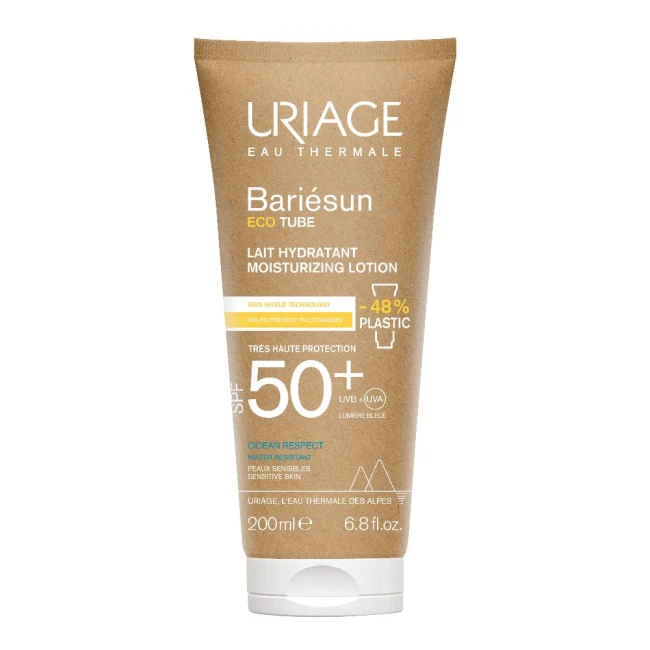 Latte delicato che funge da crema solare e che idrata la pelle, caratterizzato da una texture leggera e resistente all'acqua.
