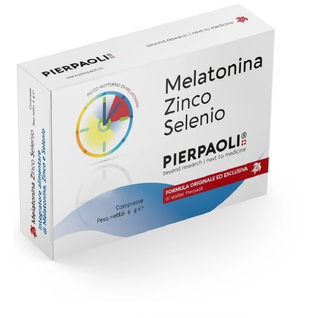 Melatonina Pierpaoli contribuisce alla riduzione del tempo richiesto per prendere sonno; l'effetto benefico si ottiene assumendo 1 mg di Melatonina poco prima di andare a dormire. La Melatonina contribuisce ad alleviare gli effetti del jet lag. Lo Zinco contribuisce alla normale funzione del sistema immunitario e alla protezione delle cellule dallo stress ossidativo. Il Selenio contribuisce alla protezione delle cellule dallo stress ossidativo e alla normale funzione tiroidea. Formula originale nata dalle osservazioni scientifiche maturate nel corso di cinquant'anni di ricerca e studi clinici condotti dal Prof. Walter Pierpaoli e dai suoi collaboratori, sulla Melatonina e sulla ghiandola Pineale, e sul loro stretto rapporto con i meccanismi dell'invecchiamento. La Melatonina Zinco Selenio Pierpaoli è stata sviluppata con l'intento di ottenere un picco di rilascio di Melatonina durante la notte ed è stata formulata per soddisfare il fabbisogno delle funzioni fisiologiche dell'organismo.